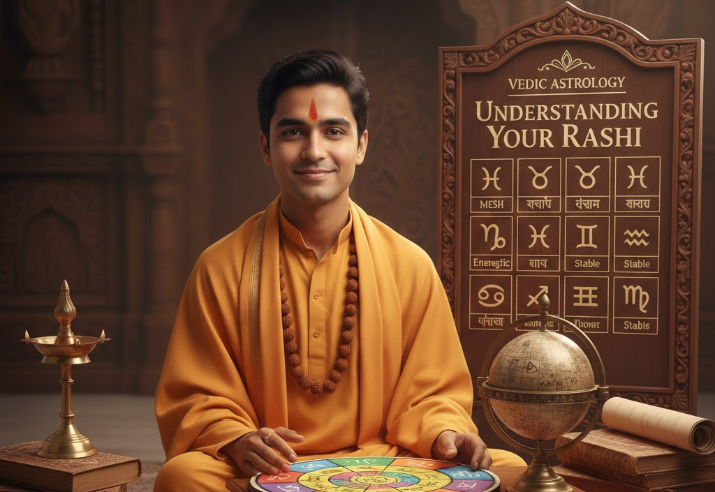 वैदिक ज्योतिष में राशि का अर्थ है आकाश को 12 भागों में बाँटना। जन्म समय पर चंद्रमा जिस राशि में होता है, वही आपकी चंद्र राशि कहलाती है।